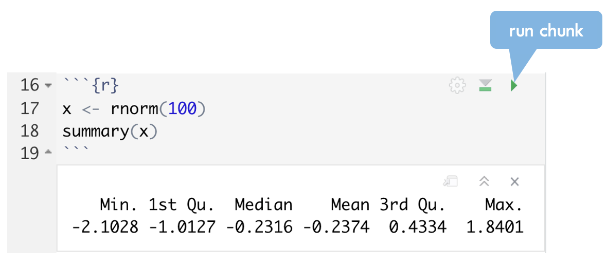Run each chunk by clicking the green “play” button (