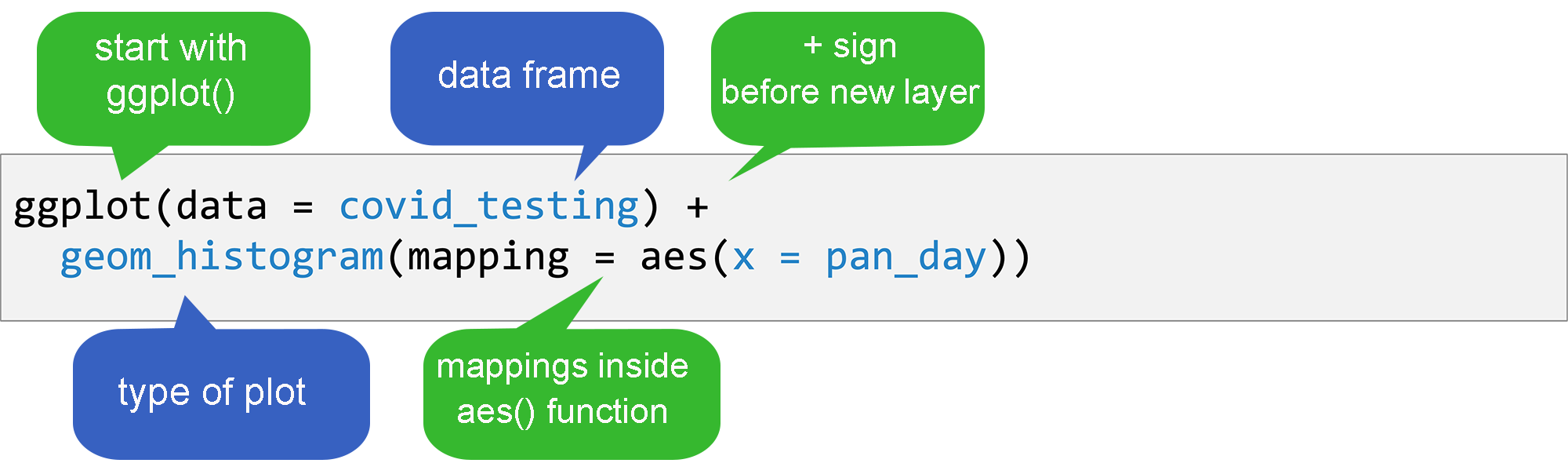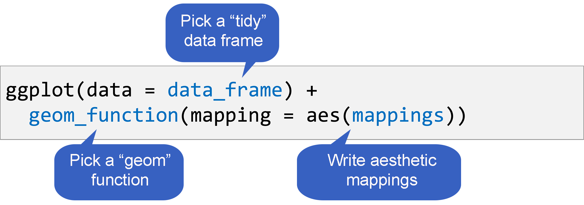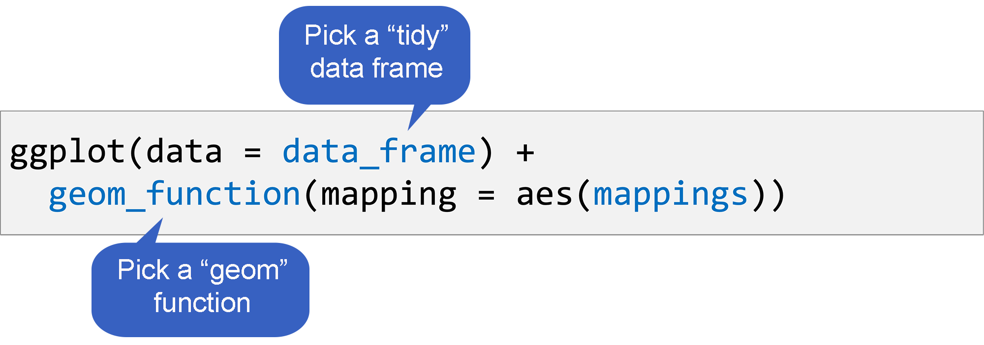 A geom function, which tells R what kind of plot to make; and