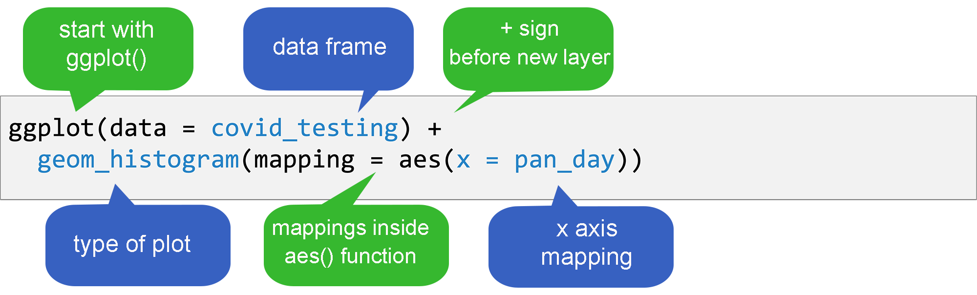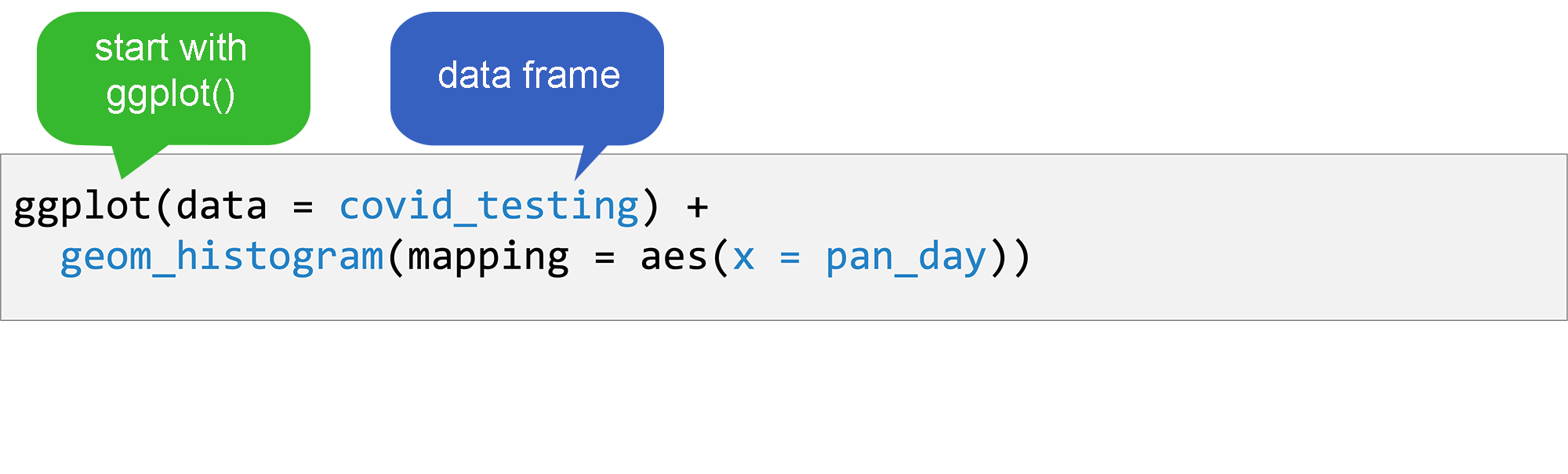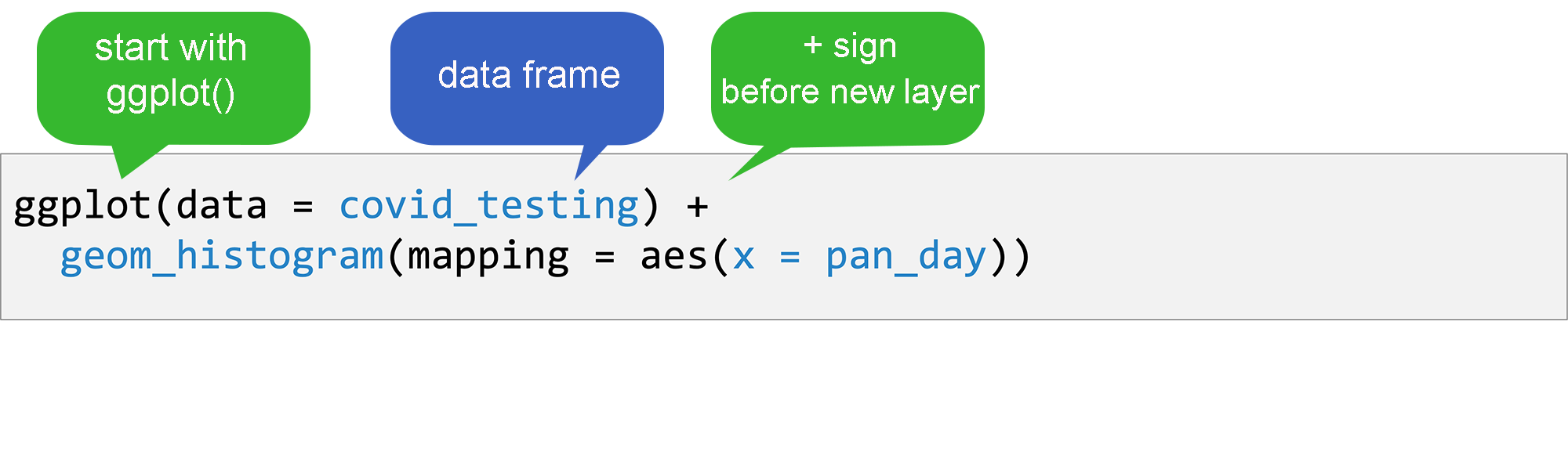 A geom function, which tells R what kind of plot to make; and