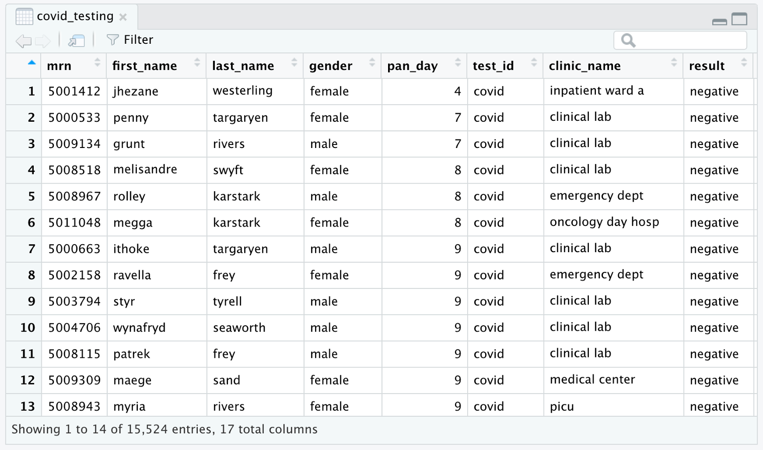 Consider the covid_testing data frame.