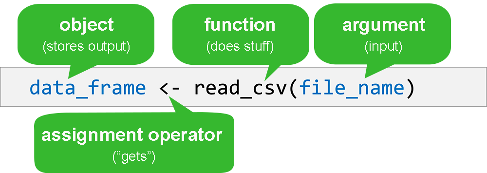 Functions do stuff. They accept Arguments as input and return an Output. Capture an output in an Object using the assignment operator ( <- ).