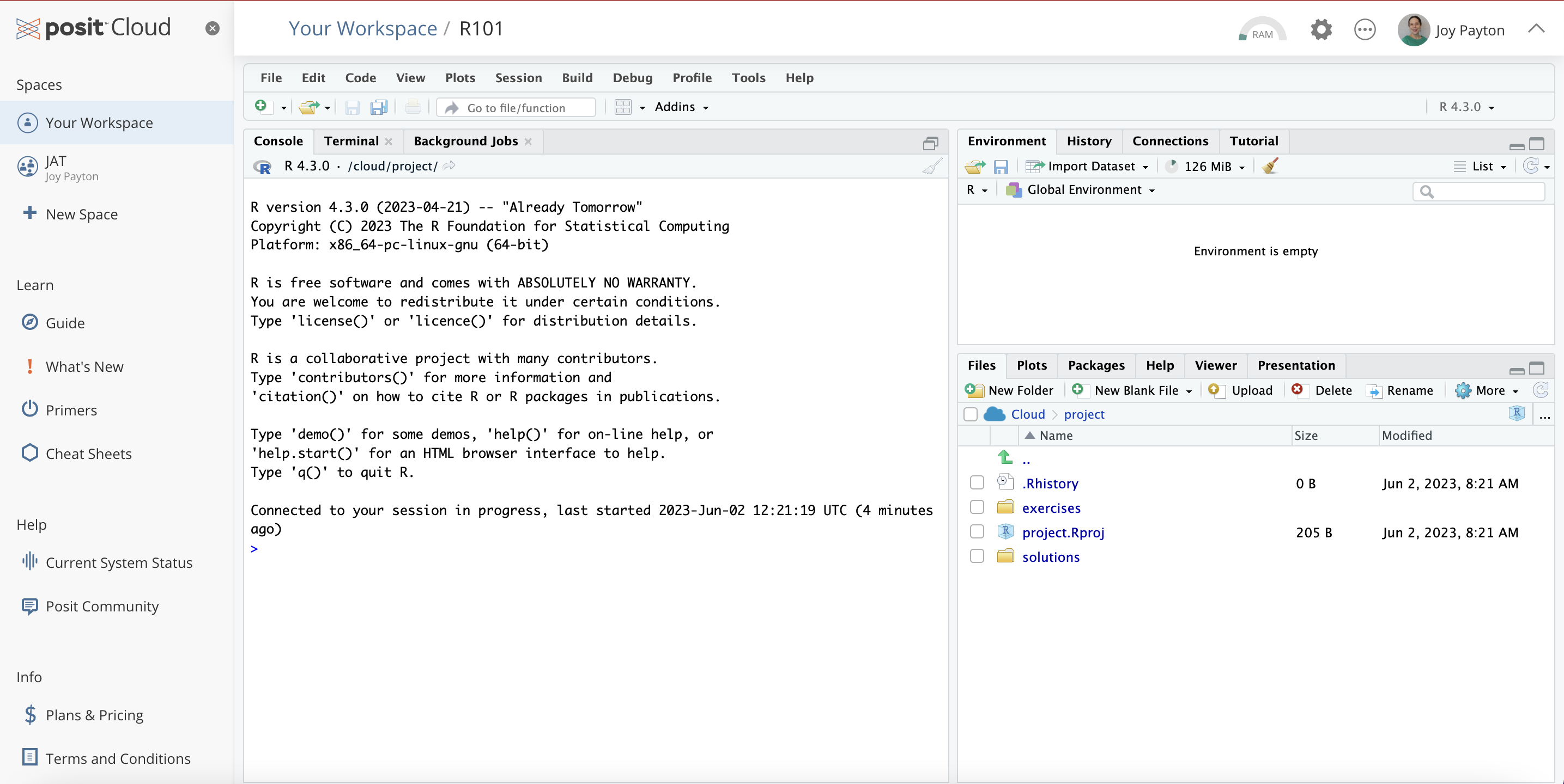 Go to https://posit.cloud/content/6121691 in your browser. If you’re not already logged in, log in to Posit.cloud.